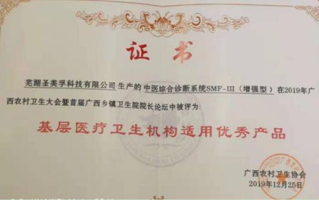 在此次大會上,蕪湖圣美孚科技有限公司生產(chǎn)的中醫(yī)綜合診斷系統(tǒng)SMF-Ⅲ(增強型)在2019年廣西農(nóng)村衛(wèi)生大會暨首屆廣西鄉(xiāng)鎮(zhèn)衛(wèi)生院院長論壇中被評為“基層醫(yī)療衛(wèi)生機構適用產(chǎn)品”。